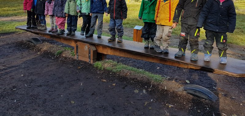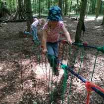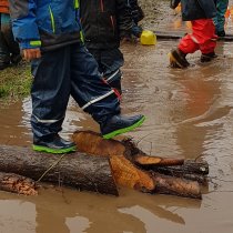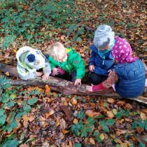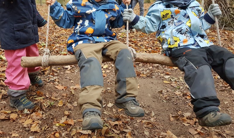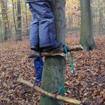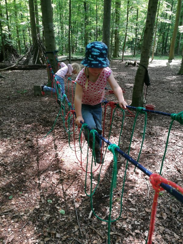 Der Wald als Turnhalle: weite Räume, unebene Böden, unterschiedlichste Hindernisse, die überklettert, übersprungen, umgangen werden müssen. Hier ist Ausdauer gefragt, ebenso wie Geschicklichkeit und Gleichgewichtssinn. Zusätzliche Anreize mit dem Schwerpunkt Bewegung setzten wir durch Aufbauten von Seilkonstruktionen, Ballspiele, Aufbau der Slackline etc.