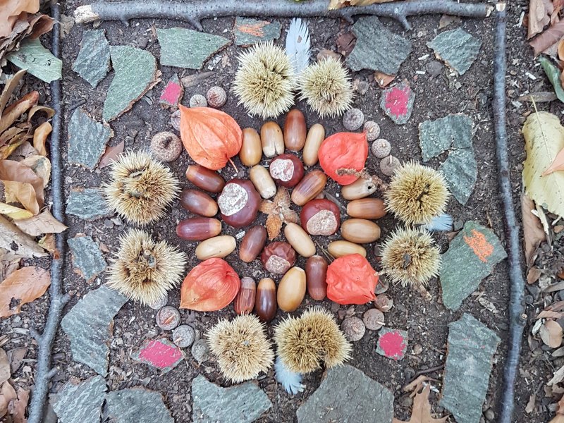 „Dieser Sonnenstrahl wärmt. Komm wir setzen uns hinein!" „Lass uns Pferd spielen! Wo ist unser Haus, der Stall ... Wer ist der Vater, die Mutter, das Kind ...? Wir brauchen noch einen Herd!" Es gibt kaum vorgefertigtes Spielzeug das die Handlungen vorgibt. Die Spielmaterialien (Stöcke, Kastanien, Blätter) haben wechselnde Funktionen und erhalten erst über die Verständigung ihren Sinn. Es gibt viel zu entdecken, was immer zur Wortschatzerweiterung führt. Dazu dient auch der Morgenkreis, wo gesungen, gerätselt, erzählt und das gemeinsame Projektthema erarbeitet wird.