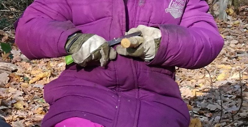 Ohne vorgefertigtes Spielmaterial, müssen besonders im Wald selbstständig Spielideen entwickelt und zum Basteln passende Materialien gesucht werden. Das mitgebrachte Werkzeug hilft dabei.