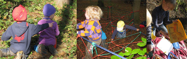 Gespielt wird mit allem, was Wald und Wiese je nach Jahreszeit bieten. Herkömmliches Bastelmaterial, wie Schere, Stifte und Pinsel sowie Bücher oder Seile ergänzen dieses.