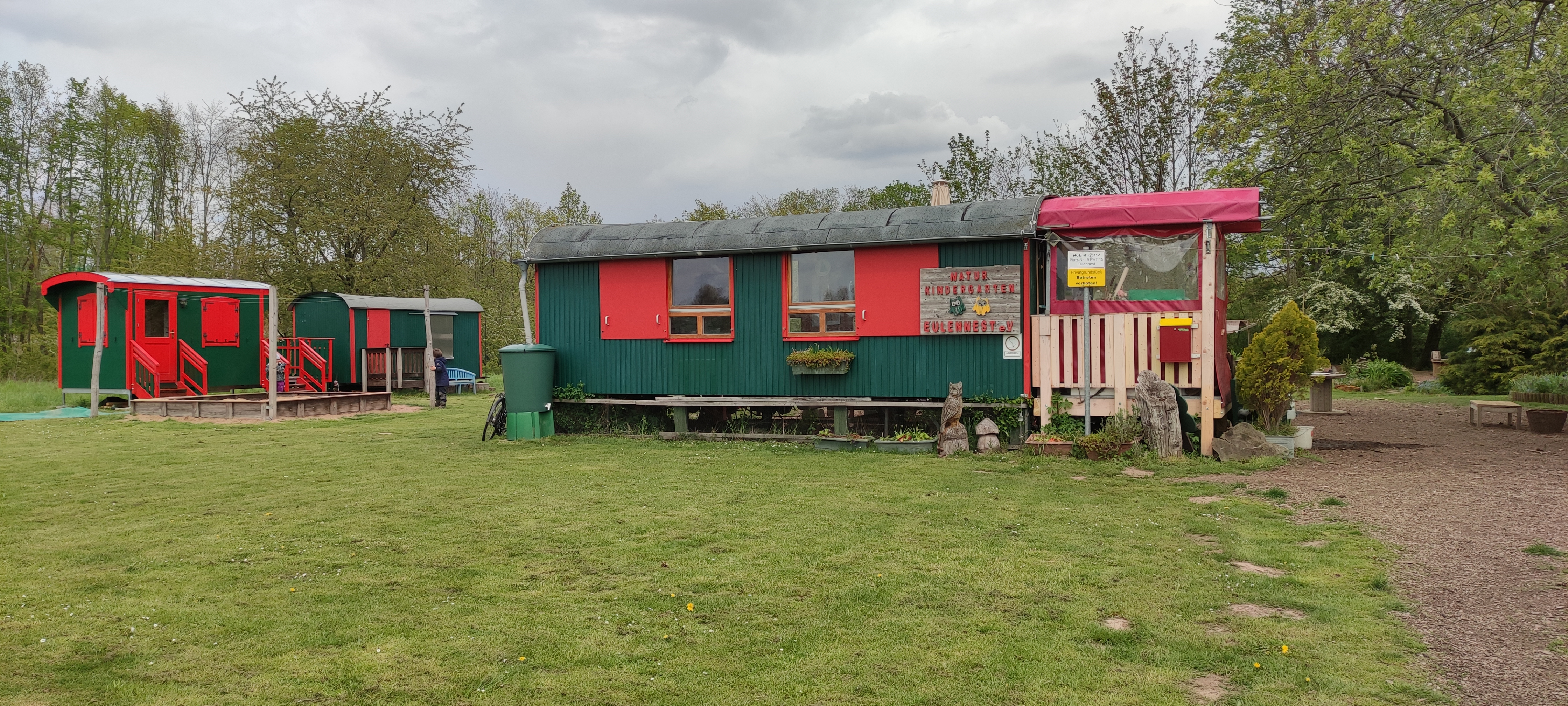 Der Tag der Eulennest-Kinder beginnt an unserem Standort kurz vorm Wald in Pulheim-Stommelerbusch. Zwischen 7:45 und 8:45 Uhr können die Kinder gebracht werden. Treffpunkt ist die Wiese, auf der drei beheizbare Bauwagen stehen.